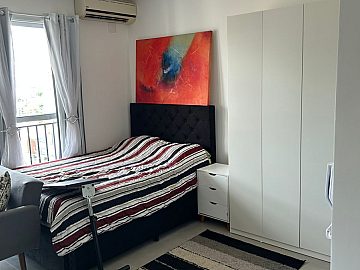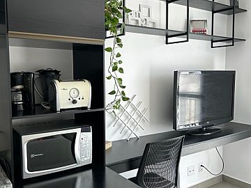 A unidade é toda decorada e mobiliára com cozinha pllanejada (completa), ar condicionado, bancada para refeições e para estudo (homeworking), TV de 55 polegadas, armário duplo, banheiro com box blindex, sofa cama mecanizado (opcional a alteração para cama tradicional) e varanda com vista livre (eterna). Andar Alto