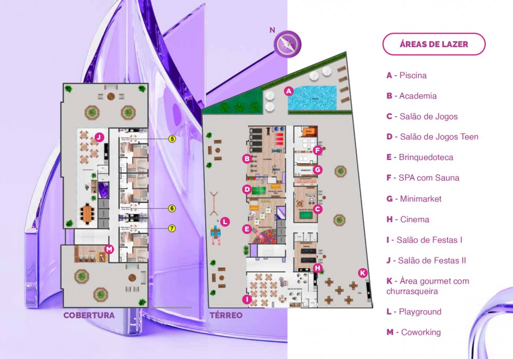Minimarket / Coworking / Academia / Playground / Salão de festas / Spa com sauna / Salão de jogos teen / Cinema